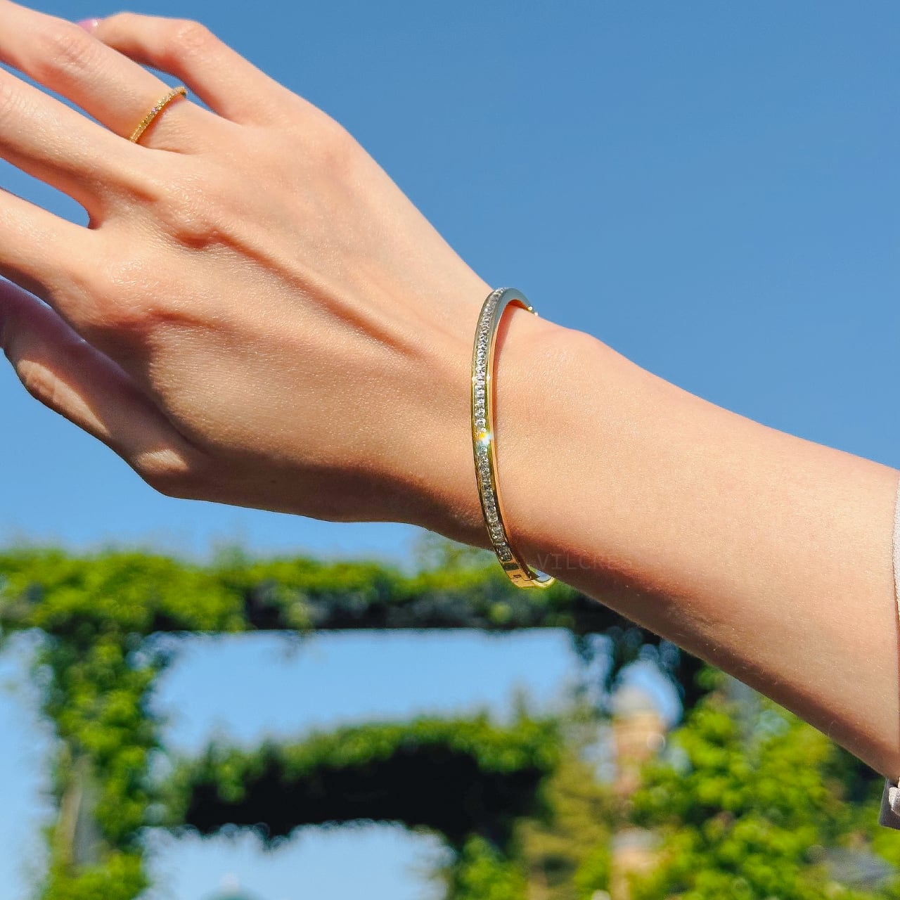 煌めくジルコニアが一列に並ぶ、ハーフエタニティデザインのバングル。
