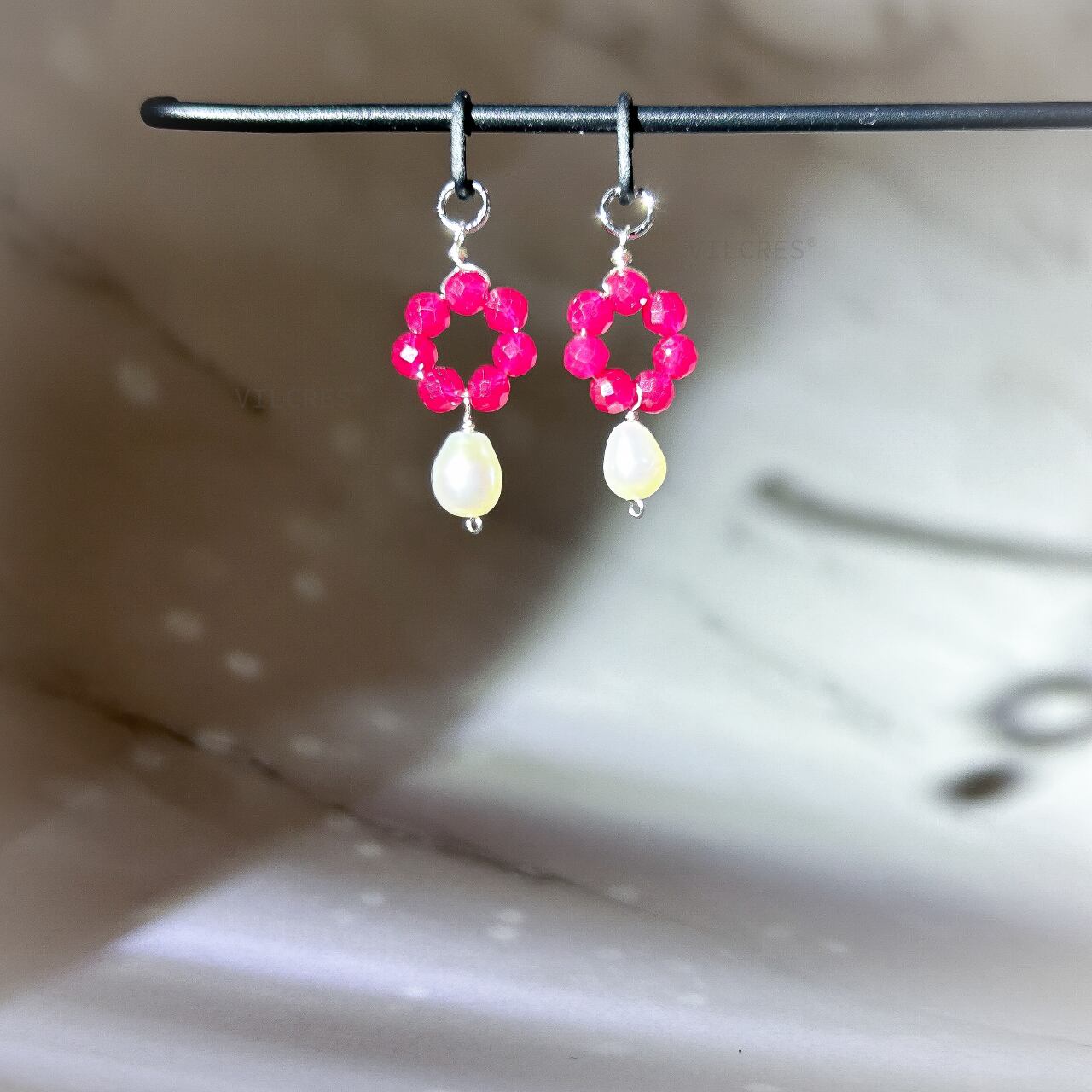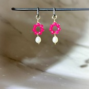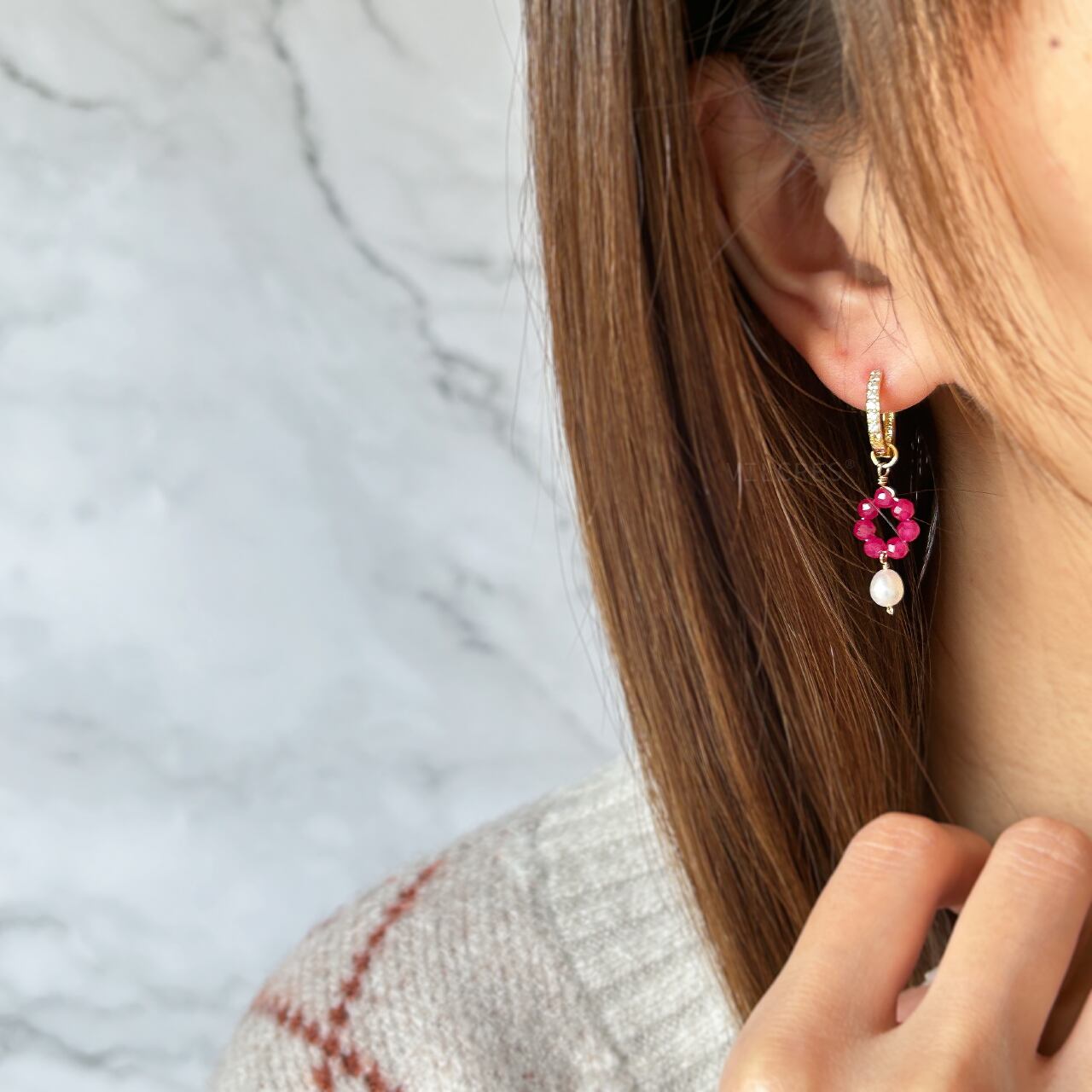 深紅の輝きがひときわ美しいピジョンブラッドルビーと、淡水パールの上品な光沢を合わせたチャーム。