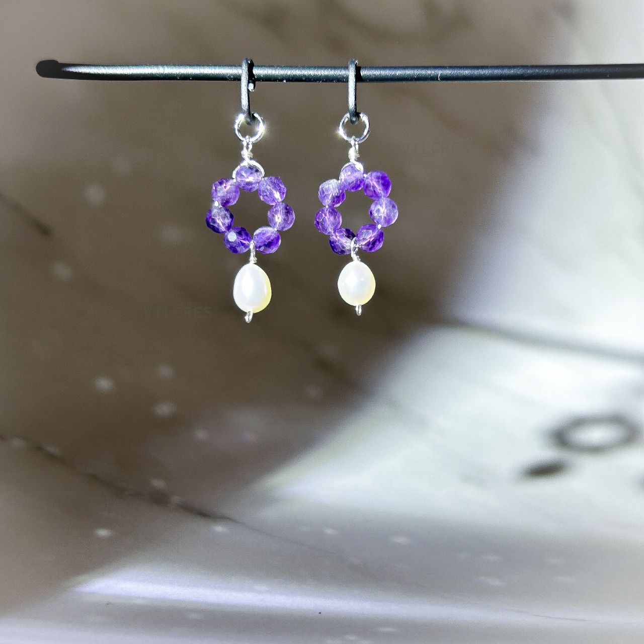 透明感のあるアメジストが光を受けて輝き、耳元をエレガントに彩ります。