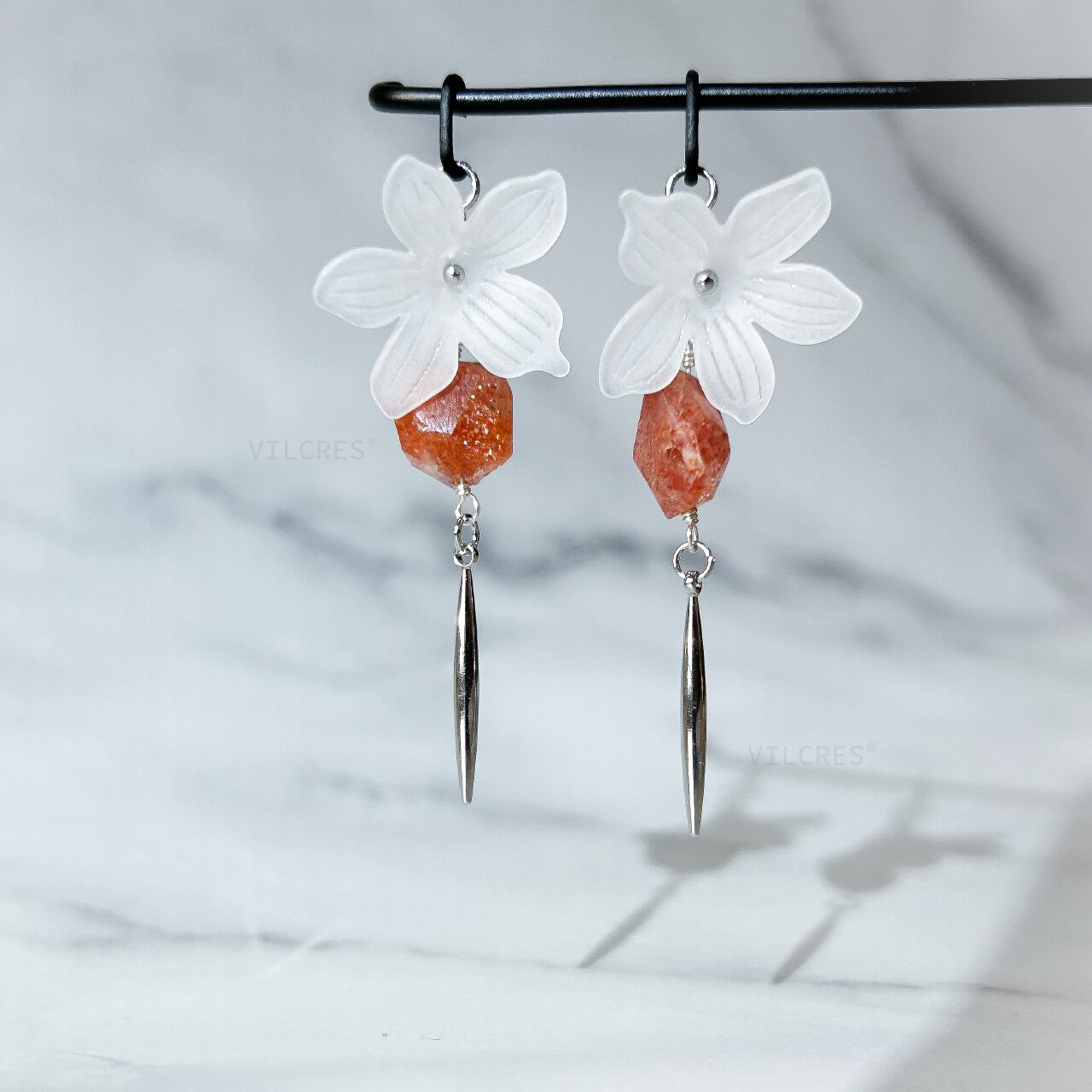 光を受けるたびに繊細にきらめくサンストーンが、耳元を明るく彩ります。